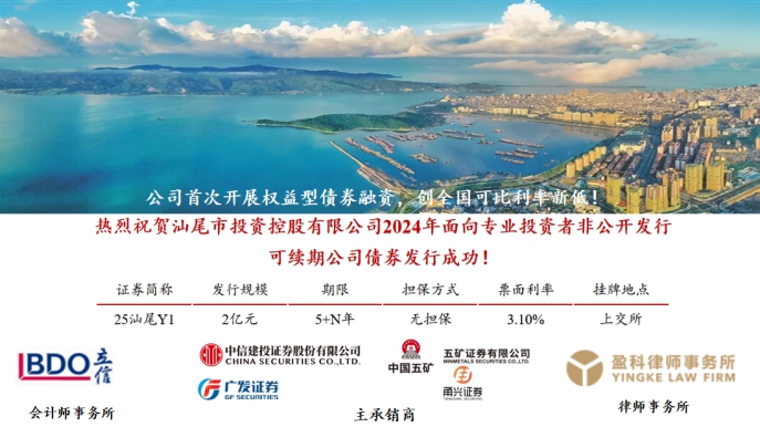 2025年2月19日,汕尾市投資控股有限公司(以下簡稱“投控公司”)在上海證券交易所成功發(fā)行2億元無擔??衫m(xù)期公司債券,發(fā)行期限5+N年期,票面利率3.10%,本次為公司首次發(fā)行權益類產(chǎn)品,發(fā)行利率創(chuàng)公司歷年發(fā)行公司債券利率新低。 本次成功發(fā)行可續(xù)期公司債券,是公司對權益型債券產(chǎn)品融資的一次全新探索,也是融資模式的進一步創(chuàng)新突破,有效降低公司資產(chǎn)負債水平和融資成本,提升公司剛性債務保障能力,為公司后續(xù)承接重大項目打下了堅實基礎。下來,市投控公司將緊緊圍繞省委“1310”具體部署和市委“1+2+9”工作安排,進一步提升資產(chǎn)規(guī)模、拓寬融資渠道、創(chuàng)新融資模式,奮力提升國企戰(zhàn)略支撐能力,引導推動優(yōu)質金融資源聚焦重點產(chǎn)業(yè),為汕尾經(jīng)濟社會高質量發(fā)展貢獻更多投控力量。